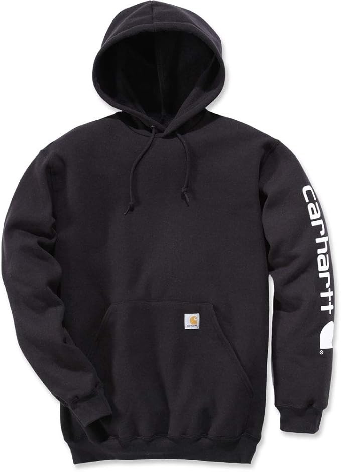 Carhartt's midweight hooded logo-sleeve sweatshirt comes in great colors. Made of a 10.5-ounce, 50% cotton/50% polyester blend, it features an attached hood with draw-cord closure, front hand-warmer pocket, spandex-reinforced rib-knit cuffs and waistband. The carhartt logo is printed on the sleeve and a logo patch is sewn on the pocket.