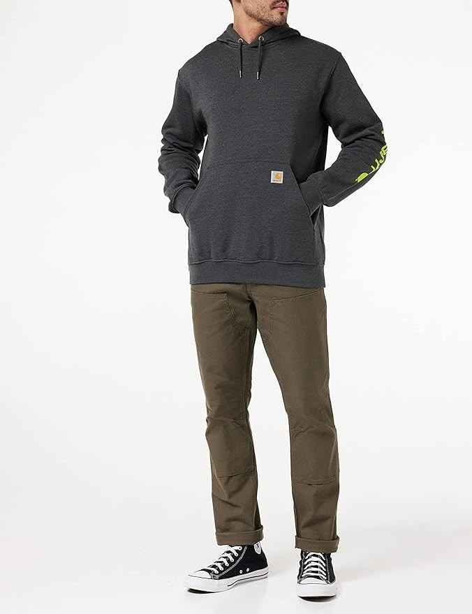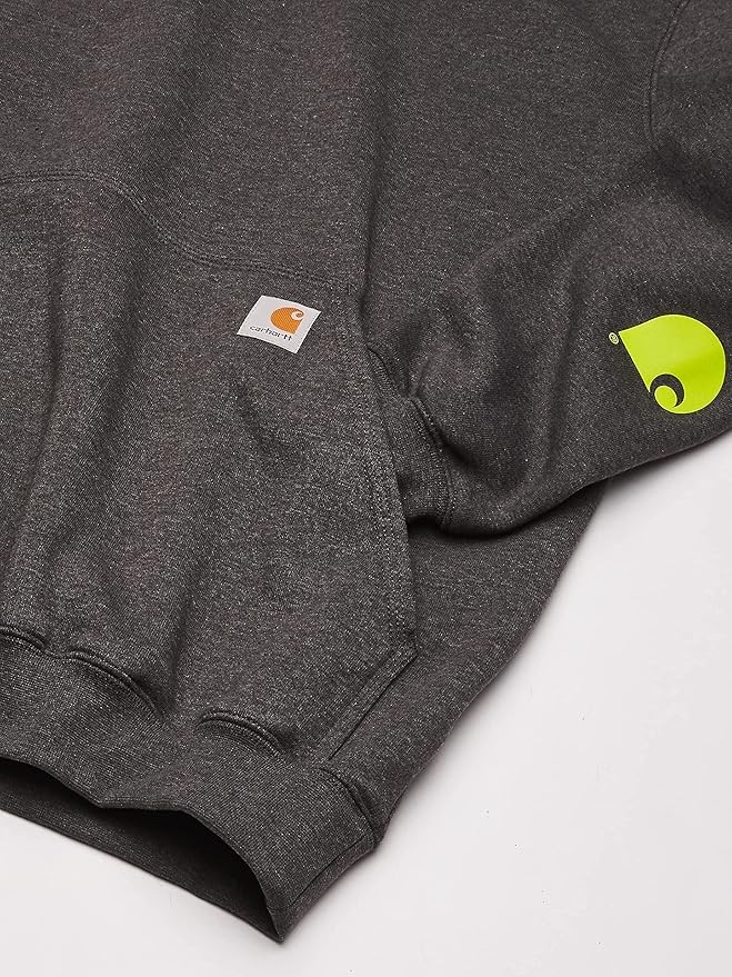 Carhartt's midweight hooded logo-sleeve sweatshirt comes in great colors. Made of a 10.5-ounce, 50% cotton/50% polyester blend, it features an attached hood with draw-cord closure, front hand-warmer pocket, spandex-reinforced rib-knit cuffs and waistband. The carhartt logo is printed on the sleeve and a logo patch is sewn on the pocket.