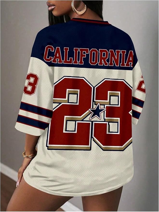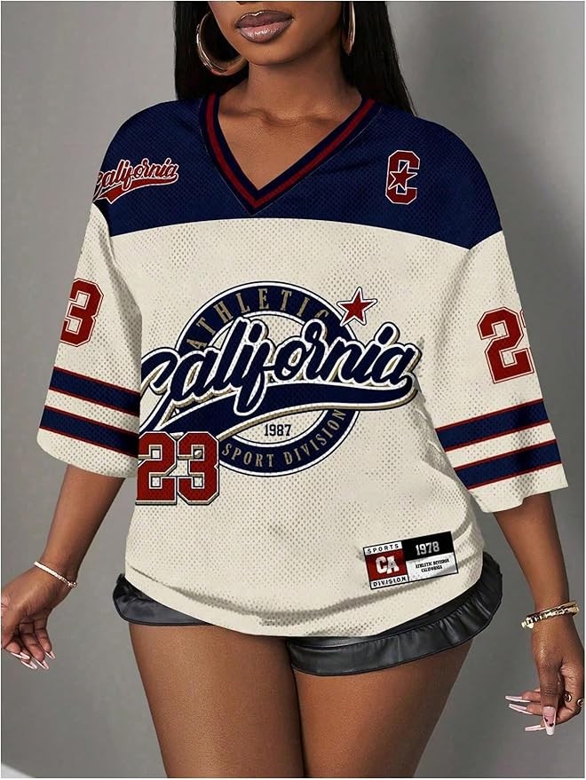 Features: Jersey shirts for women, number print, letter, graphic, v neck, 3/4 length sleeve, loose fit, mesh, casual, jersey top, jersey tee, jersey t shirts